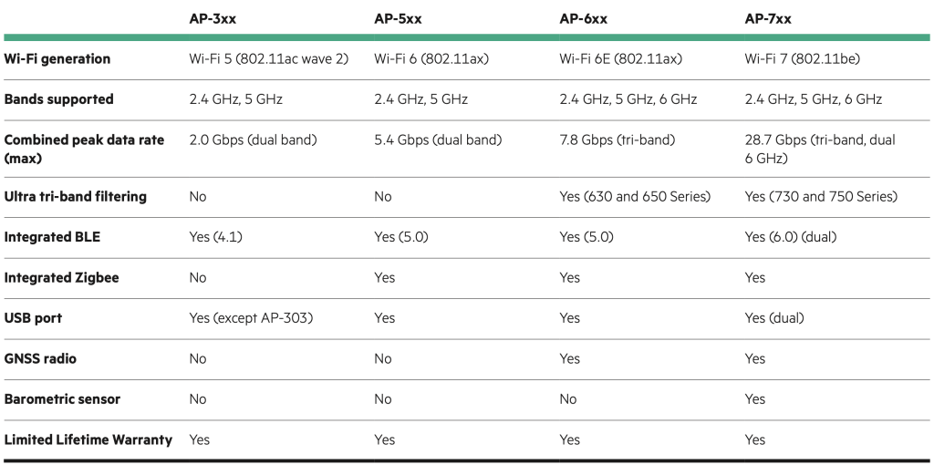 Сравнительная таблица разных поколений точек доступа Wi-Fi HPE Aruba Networking