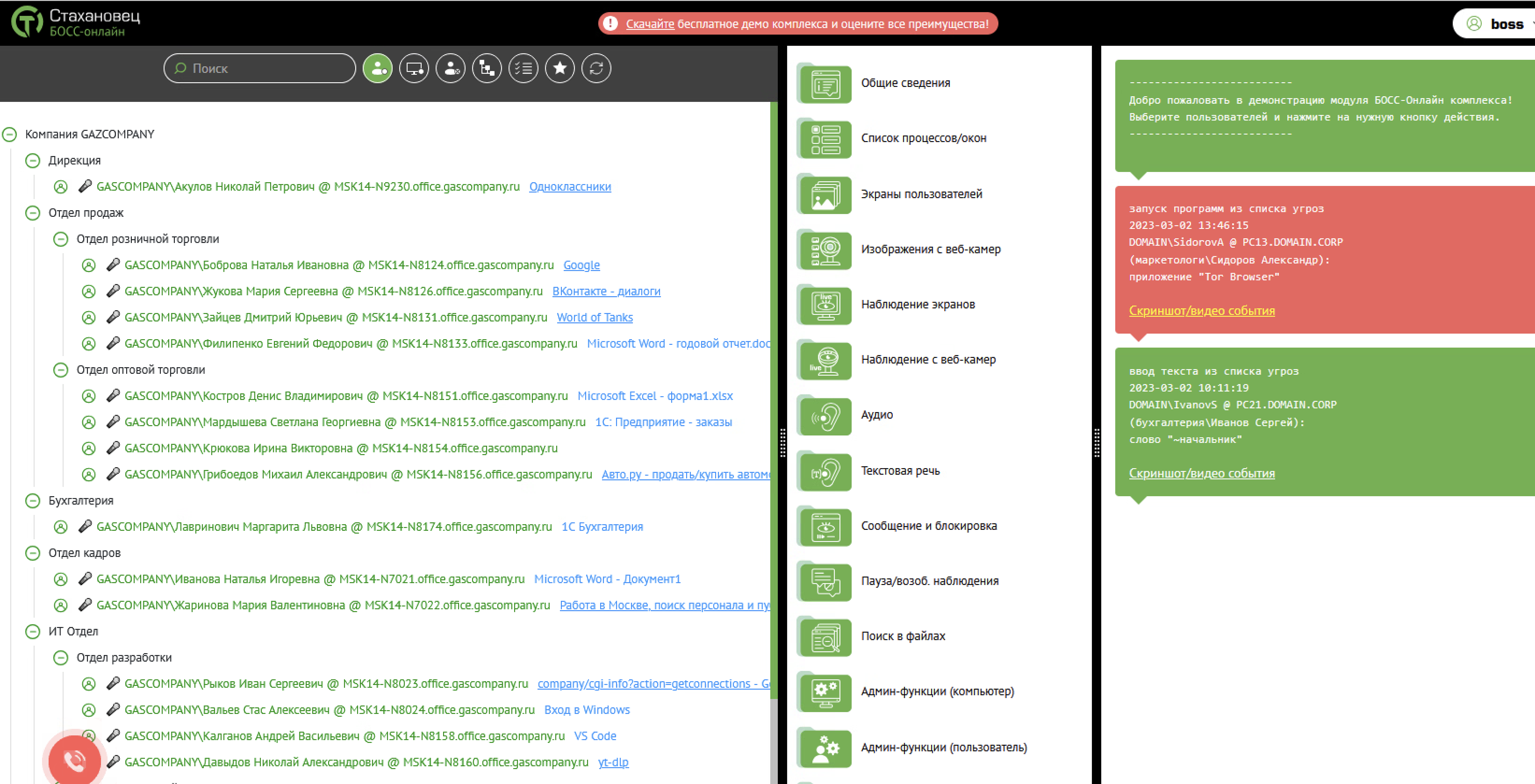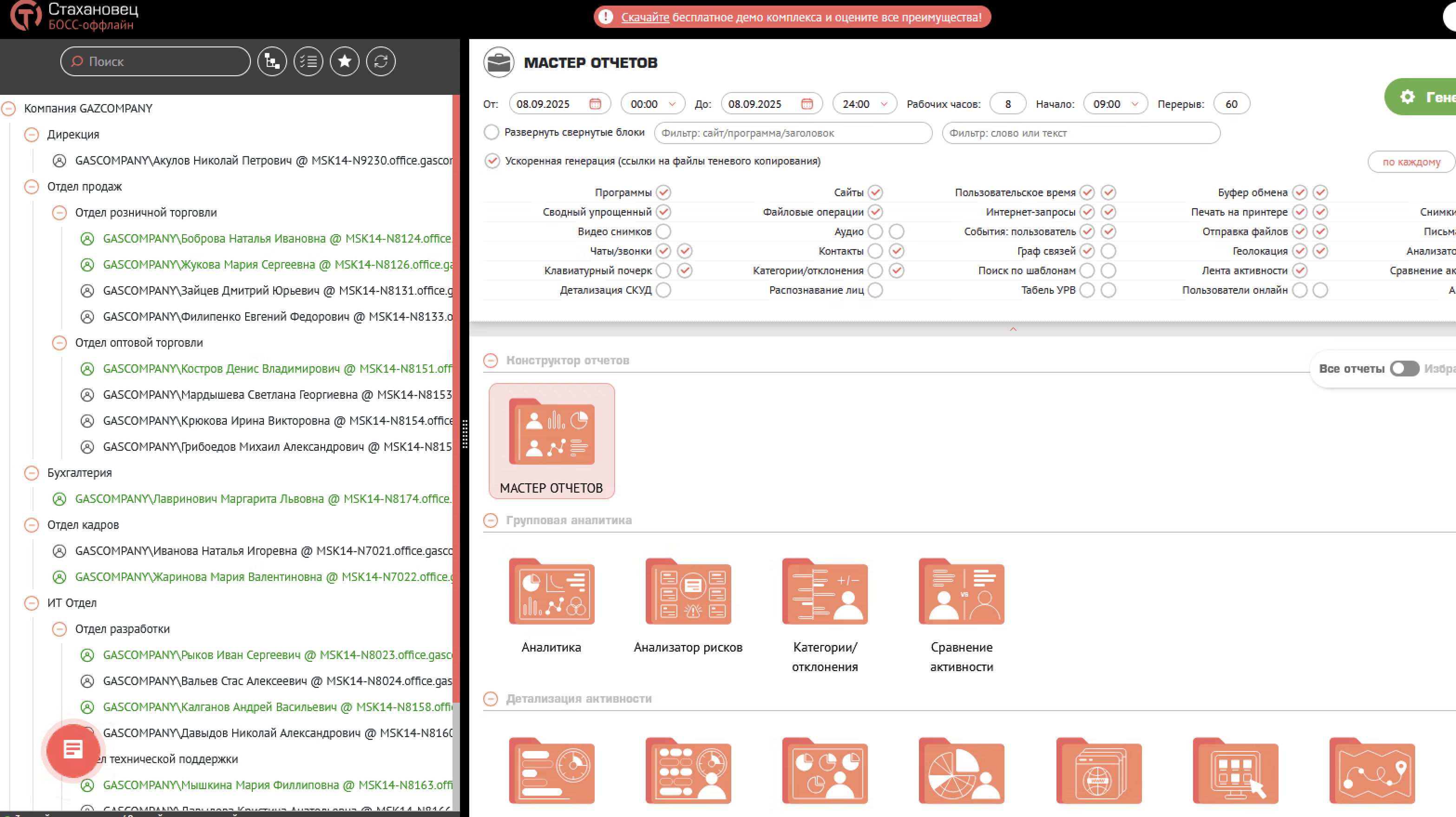 Стахановец представляет собой многофункциональную платформу, предназначенную для предотвращения утечек конфиденциальных данных и контроля активности пользователей. Решение сочетает возможности DLP-системы с инструментами анализа производительности труда, обеспечивая комплексную защиту информационных активов организаций.