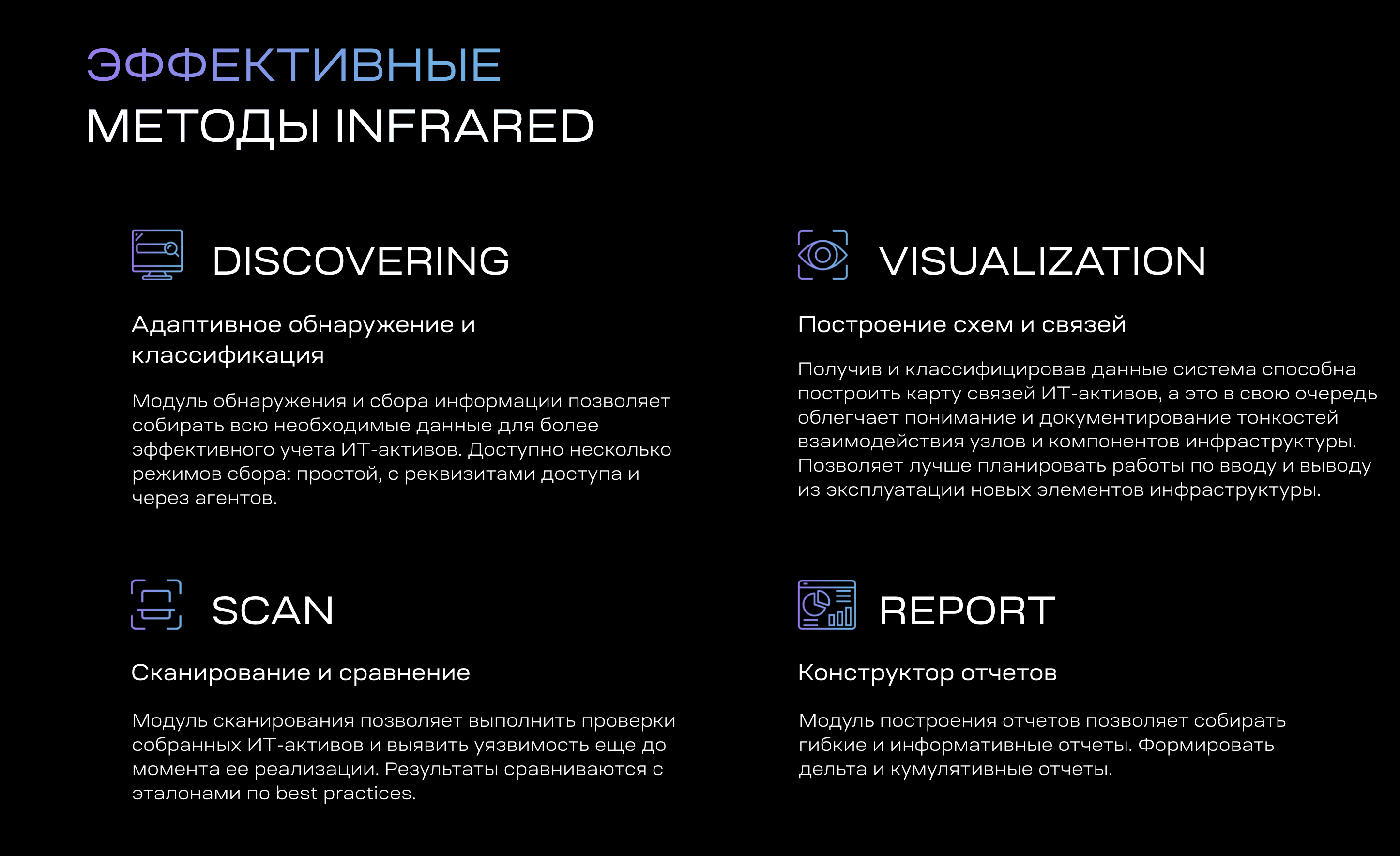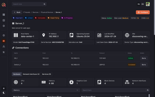 AlphaSystems InfraRed обеспечивает автоматизированный сбор и инвентаризацию данных о конфигурации ИТ-инфраструктуры. Платформа обнаруживает и документирует аппаратные активы, программное обеспечение, сетевые устройства и сервисы, устанавливая взаимосвязи между ними. Система предоставляет инструменты для анализа воздействия изменений и выявления уязвимостей в конфигурациях.