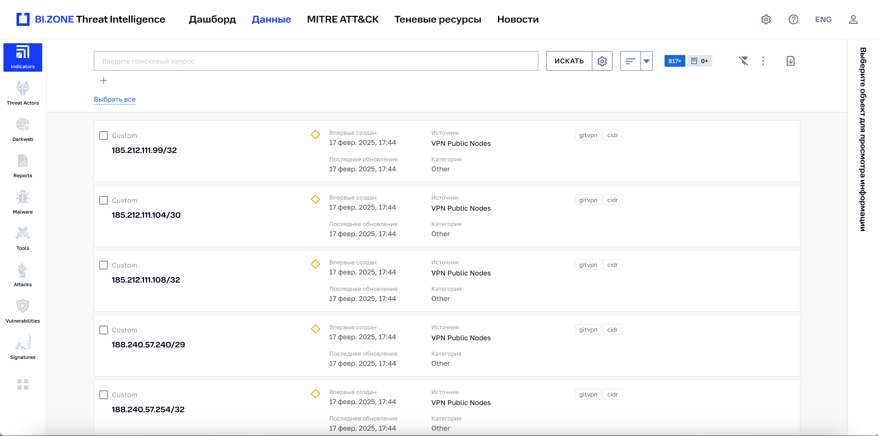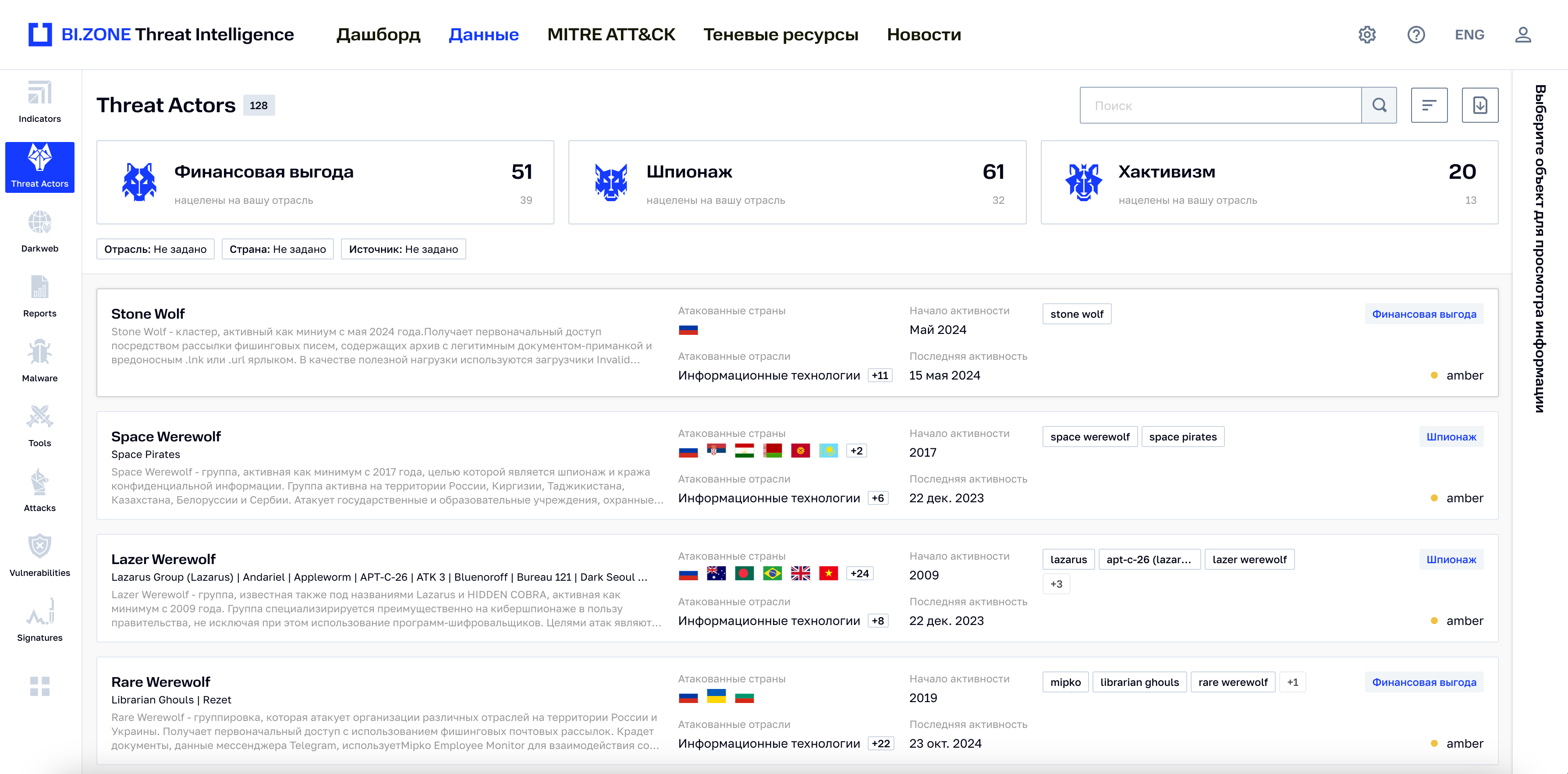 Командам кибербезопасности часто не хватает информации, чтобы приоритизировать угрозы. BI.ZONE Threat Intelligence помогает выяснить, какие из них актуальны именно для вашей компании. Портал предоставляет исчерпывающие данные о реальных атаках и кластерах активности, которые их реализуют, а также ежедневно обновляемые потоки индикаторов компрометации