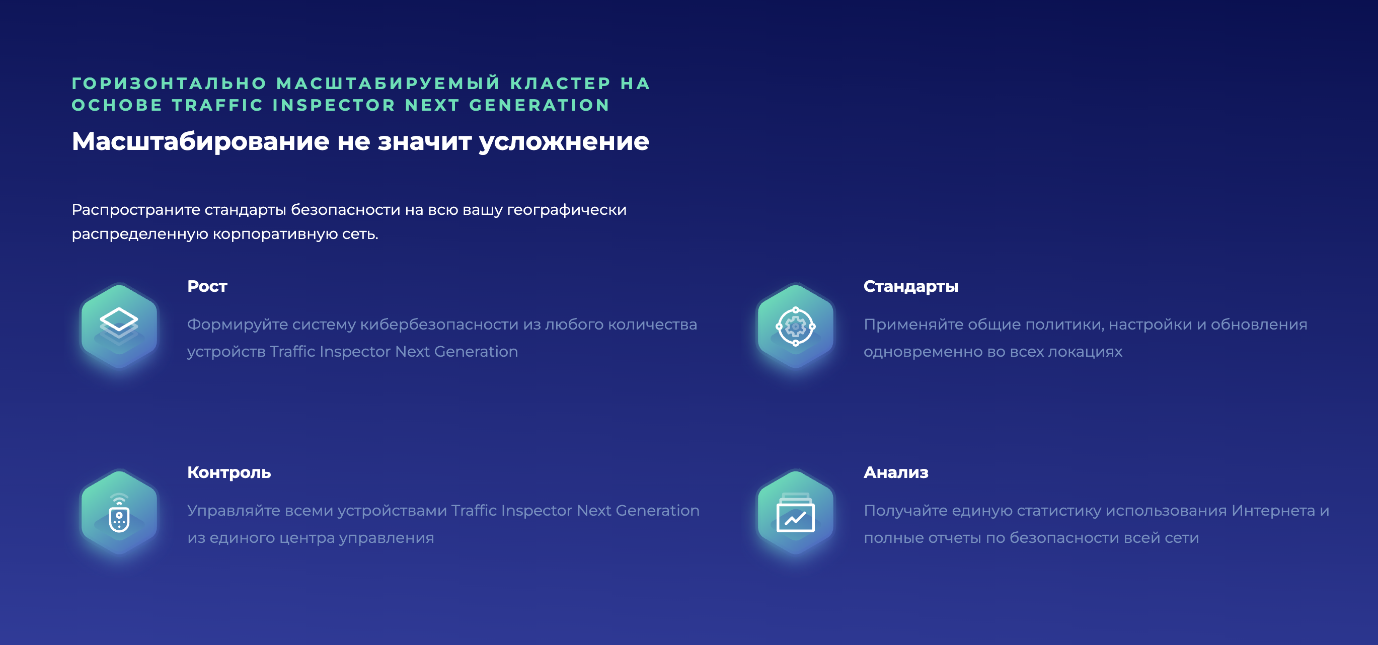 Главным преимуществом Traffic Inspector NG является его универсальность – система заменяет несколько отдельных решений по безопасности. Высокая производительность и минимальные задержки позволяют использовать продукт даже в сетях с интенсивным трафиком.