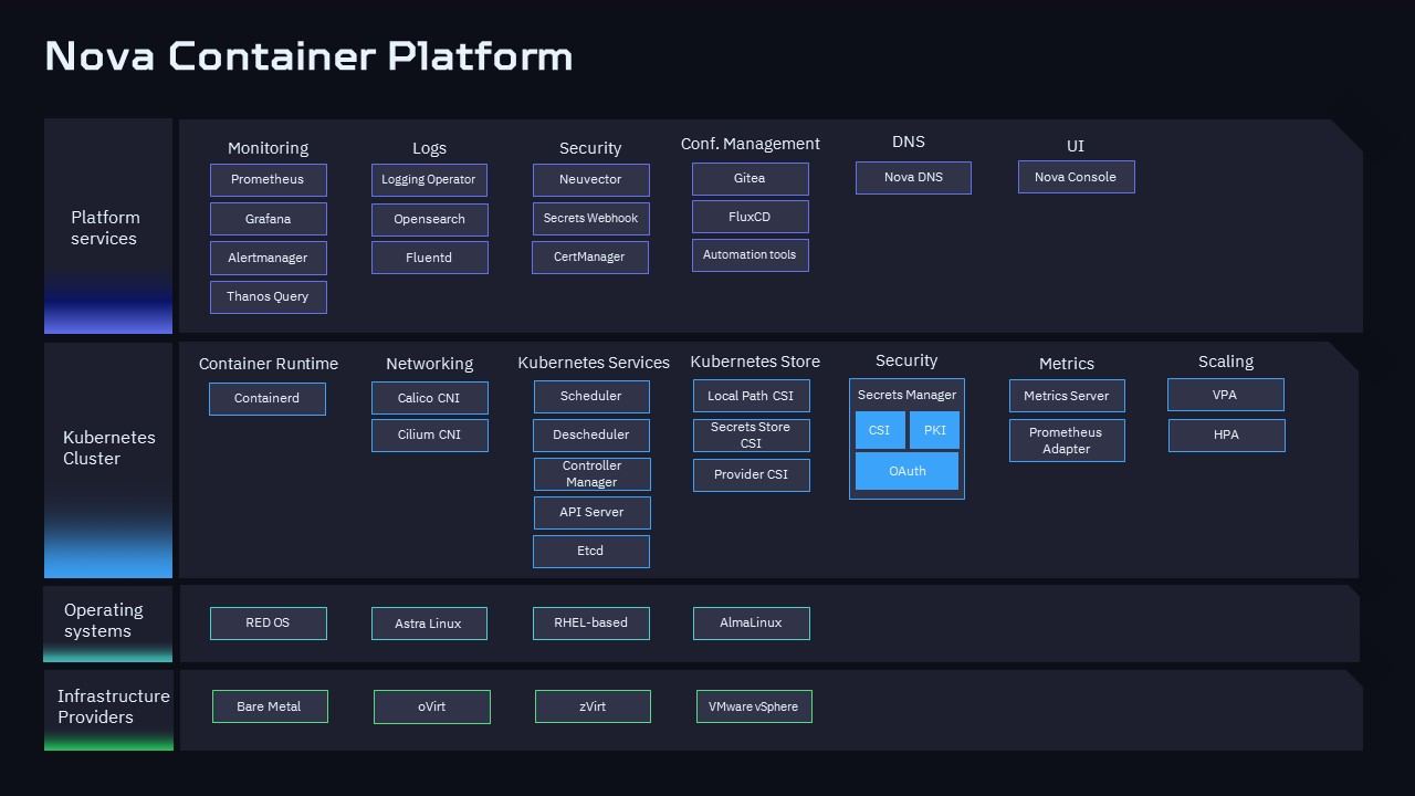 Nodus построен на современных технологиях контейнеризации с адаптацией под специфику российского рынка. В архитектуре платформы реализованы: